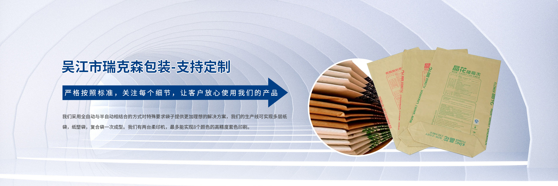 吳江市瑞克森包裝有限公司成立于2012年,坐落于蘇州太湖新城.我們主要為植脂末,奶粉,維生素等食品藥品企業提供包裝配套服務。瑞克森以安全,品質,環保,服務為經營理念,建立符合食品衛生要求的制造環境,并通過QS食品包裝安全許可證,IOS9001質量體系認證。公司始終堅持采用優質的原料跟生產工藝,生產的閥口袋,方底袋,熱封口袋,紙塑復合袋等完全能滿足全自動灌裝的要求。